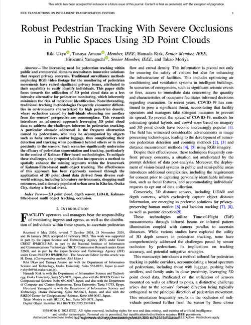 We are pleased to announce that a paper led by Riki Ukyo, who completed his Ph.D. in the 2024 academic year, has been accepted for publication in the IEEE Transactions on Intelligent Transportation Systems, a renowned international journal in the field of transportation systems.