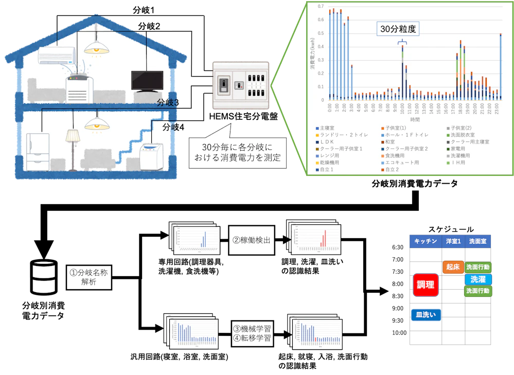 近年,家庭内の電気やガスの使用量をモニタリングし、家電機器を「自動制御」するシステムであるHEMS(Home Energy Management System)が普及しつつある.政府は「グリーン政策大綱」にて2030年までに全世帯へHEMSを設置することを目標としていることから,HEMSがこれまで以上に普及し,活用されることが望まれており,HEMSによって計測,記録された部屋やフロアといった区画や専用コンセント毎の消費電力を利用した,新しいサービスが期待される.